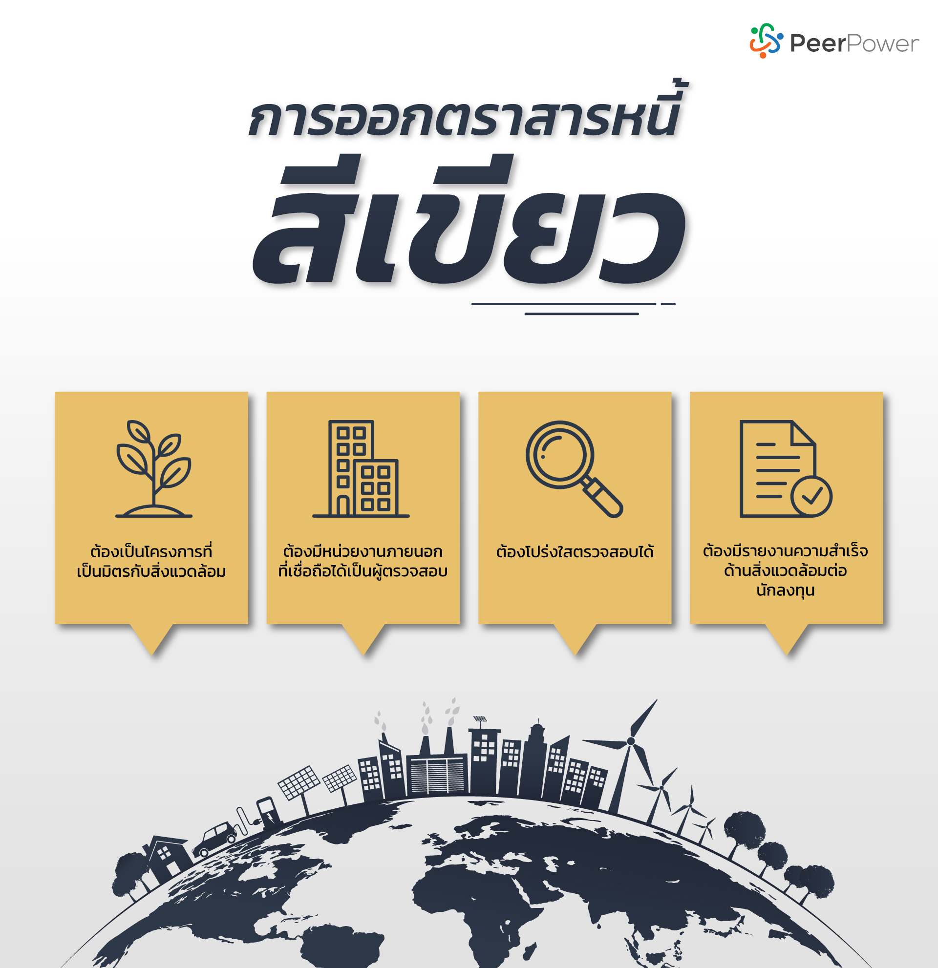 ตราสารหนี้สีเขียว (Green Bond) เป็นหนึ่งในเครื่องมือทางการเงินเพื่อให้ทุนส่งเสริมโครงการที่ช่วยลดคาร์บอน ฟุตปรินต์ เกิดขึ้นจากการประชุมด้านการเปลี่ยนแปลงสภาพอากาศโลก (Climate Change) ในช่วงปี 2015 โดยได้รับความนิยมเพิ่มมากขึ้นเรื่อยๆ ในประเทศโซนยุโรปและอเมริกาที่ตระหนักถึงความสำคัญของสิ่งแวดล้อม โดยผู้ออกตราสารหนี้ชนิดนี้จะเป็นหน่วยงานของรัฐหรือเอกชนก็ได้ ในประเทศไทยเองก็มีการออก Green Bond เช่นกัน โดย Green Bond ที่น่าสนใจและเห็นภาพในการลดก๊าซคาร์บอน อันเป็นต้นเหตุของการเปลี่ยนแปลงสภาพอากาศโลกในประเทศไทย ที่เพียร์ พาวเวอร์ ขอยกตัวอย่างมาในที่นี้คือ Green Bond ที่ออกโดยTMB ซึ่งถือเป็นธนาคารพาณิชย์แห่งแรกในประเทศไทยที่ออก Green Bond และ Green Bond ที่ออกโดย B.Grimm บริษัทผู้ผลิตพลังงานไฟฟ้าทางเลือก ซึ่งเป็นตราสารหนี้สีเขียวแห่งแรกในประเทศไทย ที่ได้รับการรับรองจาก DNV GL ซึ่งเป็นสมาชิกที่ผ่านการรับรองจากคณะกรรมการ Climate Change Initiative เป็นที่แรกในประเทศไทย